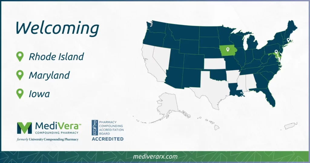 At MediVera Compounding Pharmacy™ , we’re thrilled to announce our newest service areas in the beautiful states of Rhode Island, Maryland, and Iowa. Just as we’ve made a positive impact through our recent additions of Florida and Missouri, we’re excited to extend our commitment to top-quality compounding pharmacy services to these diverse regions. We’ve marked our journey with excellence in personalized healthcare solutions and a legacy of trustworthiness. We can’t wait to embark on this new chapter with the residents of these states!